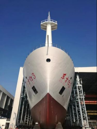 昨天上午,“东方红3”船下水“掷瓶礼”现场,伴随着船舶鸣响汽笛声以及热烈的掌声,船舶在拖曳牵引下缓缓驶向试验港池,标志着我国自主创新研发的新一代深海大洋综合科学考察实习船“东方红3”正式下水。